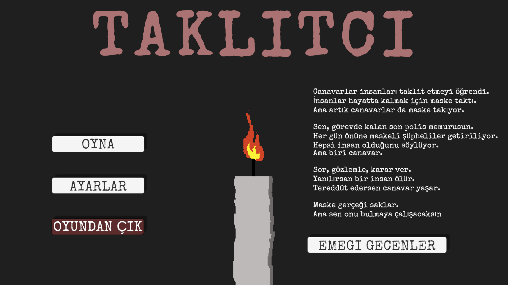 V-LIGHT ekibi olarak Global Game Jam 2026 kapsamında 48 saatte geliştirdiğimiz TAKLİTÇİ, sizi gerilim dolu bir sorgu masasına davet ediyor.